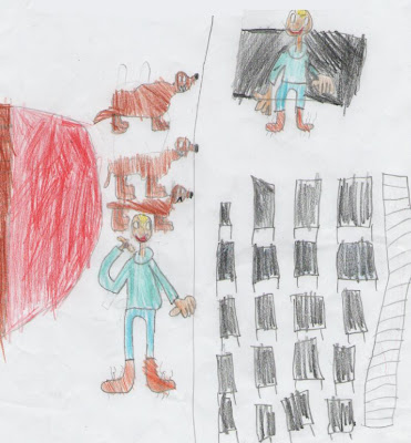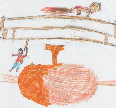 De repente, surgiram três cadelas mágicas e voadoras que agarraram o João pelos braços e retiraram–no da ponte, voando com ele por cima lago de magma.